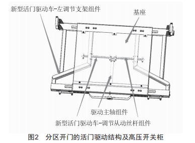 分區(qū)開門的活門驅(qū)動結(jié)構(gòu)及高壓開關(guān)柜整體如圖2所示,該裝置為一種分區(qū)開門的活門驅(qū)動結(jié)構(gòu),主要包括基座、調(diào)節(jié)支架、調(diào)節(jié)從動絲桿、驅(qū)動軸。