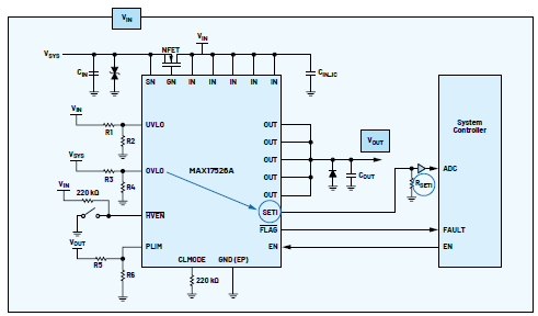 如圖11所示,MAX17526測量系統(tǒng)消耗的電流,并使用SETI引腳將其報告給系統(tǒng)控制器。電阻RSETI可以調(diào)整,以根據(jù)系統(tǒng)要求對限流水平進行編程。
