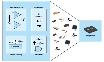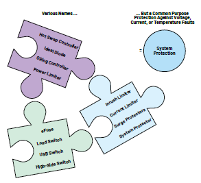 除了分立解決方案,還有許多提供單一功能保護的集成解決方案。例如,浪涌保護器(或過壓保護器)提供防浪涌電壓保護;熱插拔控制器(或沖擊限制器)可以防范沖擊電流影響;ORing控制器(或理想二極管控制器)可以防止反向電壓并提供電源分配;電子熔斷器(或限流器)可以防止短路或過載;功率限制器/負載開關/USB開關/電源選擇器為具有多個輸入電源和/或多個負載的系統(tǒng)提供管理和控制功能。圖1展示了這些產(chǎn)品,均可用于提供系統(tǒng)電源保護。然而,它們僅提供部分解決方案來保護系統(tǒng)免受電壓、電流或溫度故障的影響。因此需要一個整體解決方案來提供完整、全面的系統(tǒng)電源保護。