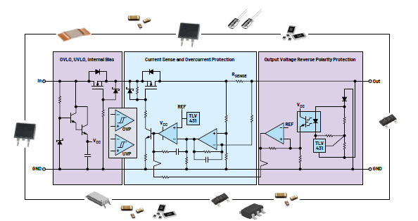 使用分立電路或部分IC實現(xiàn)保護的傳統(tǒng)方法在過去可能效果不錯,但它不適應現(xiàn)代系統(tǒng)。現(xiàn)代系統(tǒng)的電路板空間更小,開發(fā)時間更短,開發(fā)預算緊張。鑒于這種轉變,更適合現(xiàn)代系統(tǒng)的保護解決方案是什么?它應是高集成度保護IC(見圖8),需要集成場效應晶體管(FET)、電流檢測/限流、功率限制、熱保護和欠壓/過壓保護。此外,滿足Underwriters Laboratories Inc./國際電工委員會(UL/IEC)安全要求的全集成式保護IC更勝一籌。更高的集成度與安全認證相結合,可為現(xiàn)代系統(tǒng)提供可靠保護。