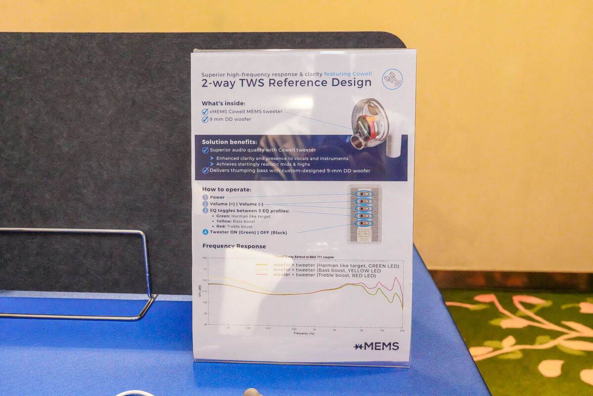 演示室展出的演示設備囊括了采用xMEMS全硅MEMS揚聲器的多種音頻解決方案,包括三種不同的xMEMS揚聲器和一種動態(tài)閥門,還包括xMEMS單單元、xMEMS + 動圈雙單元的兩種不同方案的耳機。