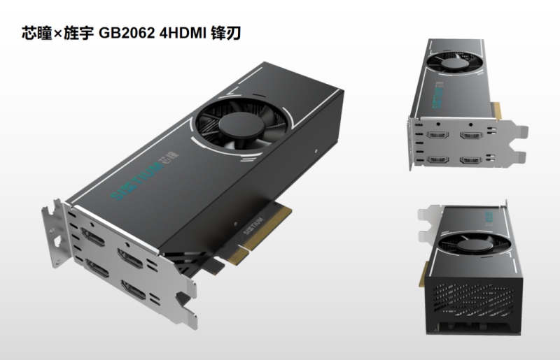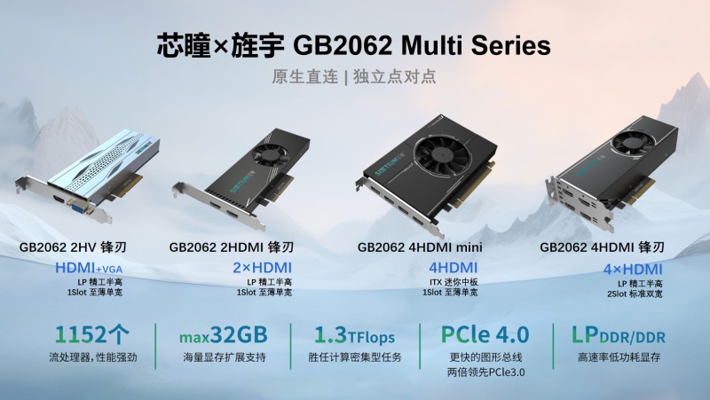 根據(jù)芯瞳與旌宇的合作發(fā)展戰(zhàn)略,針對(duì)后者成功的多屏商顯、工業(yè)顯控、行業(yè)定制化、通路消費(fèi)應(yīng)用的板級(jí)市場(chǎng)經(jīng)驗(yàn),基于第二代GB2062 GPU芯片,首先推出四款多屏顯卡,這是中國(guó)國(guó)產(chǎn)化顯卡領(lǐng)域的第一個(gè)多屏顯控概念顯卡產(chǎn)品矩陣,這也代表著芯瞳正式進(jìn)入市場(chǎng)化著陸應(yīng)用階段。首批上市新品,分別是GB2062 4HDMI mini、GB2062 4HDMI LP、GB2062 2HDMI LP和GB2062 2HV LP。