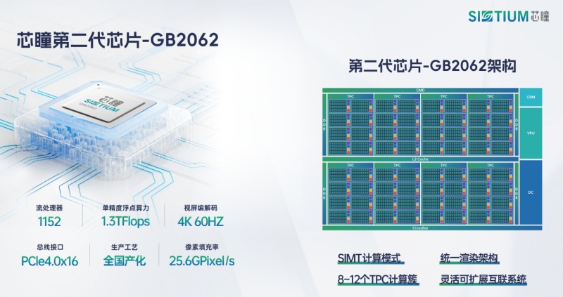 GB2062沿用芯瞳自研的“啟明”-圖形渲染架構(gòu),內(nèi)置1152個(gè)流處理核心,3D渲染性能卓越,擁有1.3TFlops浮點(diǎn)算力可勝任密集計(jì)算任務(wù),可搭載高性能低功耗的LPDDR4及DDR4顯存,容量最大可擴(kuò)展至32GB,顯存位寬高達(dá)256bit,原生支持更快的PCIe4.0圖形總線技術(shù),10W超低功耗,技術(shù)參數(shù)相當(dāng)突出。