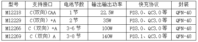 除了M12266這款芯片,深圳市永阜康科技有限公司代理的移動(dòng)電源快充芯片涵蓋1-8節(jié)電池(鋰電池、磷酸鐵鋰電池,鉛酸電池等),滿足22.5W-140W的充電需求。具體產(chǎn)品選型列表如下: