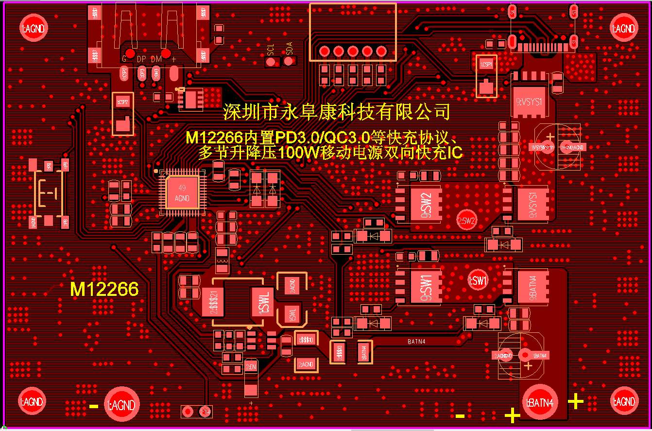 M12266概述M12266是一款面向多串電芯大功率移動(dòng)電源應(yīng)用的專(zhuān)用SOC,集成了同步升降壓電壓變換器、電池充放電管理模塊、顯示模塊、電量計(jì)算模塊,提供最大100W輸入/輸出功率,支持PD3.0、QC3.0、AFC、FCP、 SCP、BC1.2 DCP 等主流快充協(xié)議。芯片采用QFN-48封裝,配合極簡(jiǎn)的外圍電路,即可組成100W多口移動(dòng)電源。