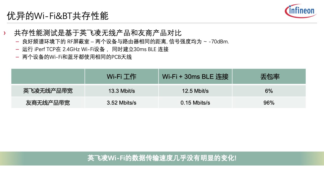 英飛凌在做了很多軟硬件上的設計,如使用獨立藍牙天線,以及單天線TDM(分時復用)的軟件解決方案,都大大降低同頻干擾的問題,以及提升藍牙在Wi-Fi傳輸時的性能。
