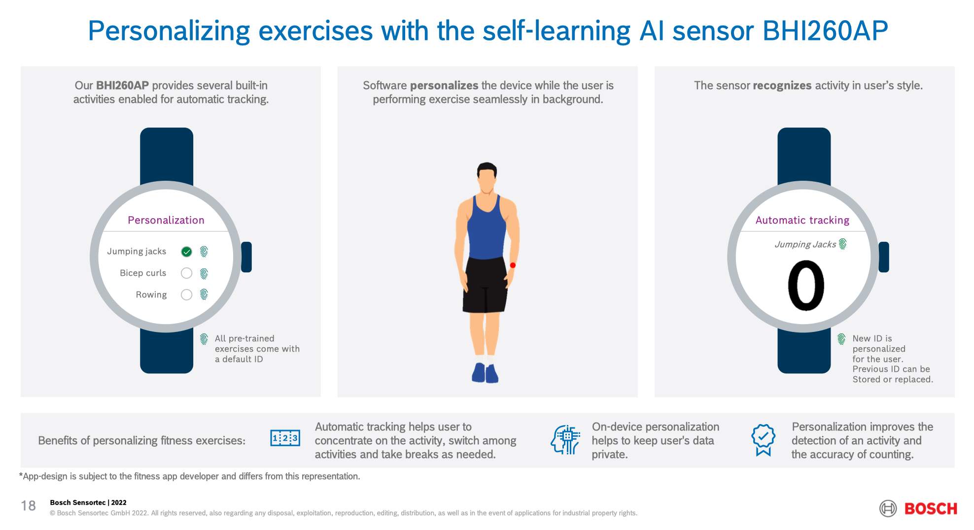皇甫杰表示,現(xiàn)在的AI傳感器BHI380,已經(jīng)集成了一些AI相關(guān)的運(yùn)動(dòng)監(jiān)測(cè)相關(guān)算法在里面,用戶可以在日常使用過(guò)程中,做一些健身的動(dòng)作,支持用戶自定義,或者用內(nèi)部自帶的動(dòng)作。該器件可以幫助用戶實(shí)現(xiàn)不同健身項(xiàng)目的無(wú)縫切換,不需要用戶去干預(yù)手表,或者需要做不同的健身動(dòng)作的時(shí)候,在手表上做特定的設(shè)置。設(shè)備可以自動(dòng)檢測(cè)用戶當(dāng)前在做什么動(dòng)作,然后用戶做了多少次,這樣的話用戶可以在做動(dòng)作的時(shí)候不參與任何干預(yù),讓整個(gè)健身過(guò)程變得更加智能。