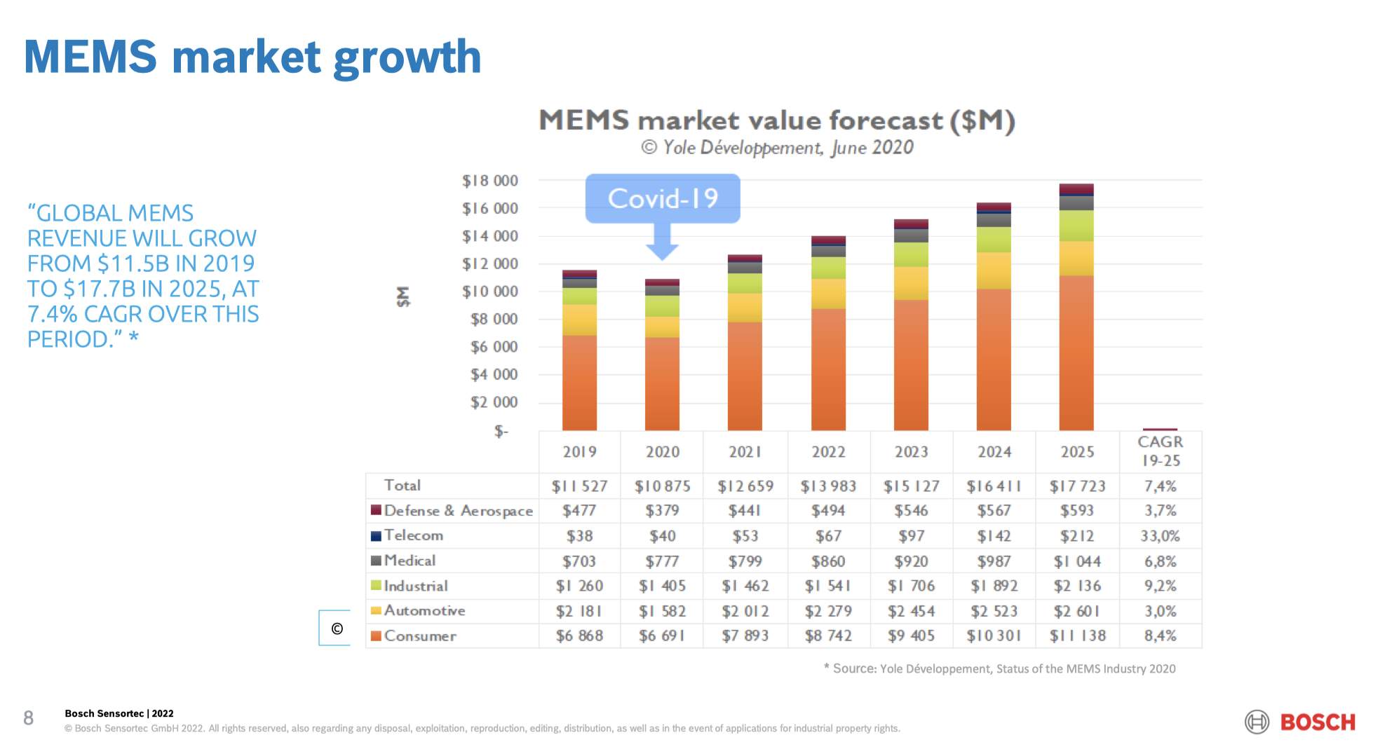 從1996年開始,Bosch推出了它第一顆MEMS傳感器到今天為止,傳感器產(chǎn)品出貨量已經(jīng)突破180億顆。Bosch的MEMS傳感器發(fā)展是從汽車開始,慢慢拓展到消費(fèi)領(lǐng)域,包括手機(jī)、穿戴產(chǎn)品,再到現(xiàn)在的IoT設(shè)備等。而據(jù)Yole的報(bào)告,全球MEMS收入將從2019年的11.5億美元增長(zhǎng)到2025年的17.7億美元,在此期間復(fù)合年增長(zhǎng)率為7.4%。而隨著AI在邊緣側(cè)落地的需求增加,智能傳感器的增長(zhǎng)需求將會(huì)推動(dòng)博世的傳感器業(yè)務(wù)進(jìn)一步加速發(fā)展。