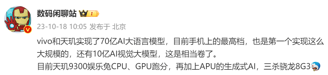 數(shù)碼閑聊站爆料稱:“vivo和天璣實(shí)現(xiàn)了70億AI大語言模型,目前手機(jī)上的最高檔,也是第一個(gè)實(shí)現(xiàn)這么大規(guī)模的,還有10億AI視覺大模型,這是相當(dāng)卷了。目前天璣9300娛樂兔CPU、GPU跑分,再加上APU的生成式AI,三殺驍龍8G3?!?