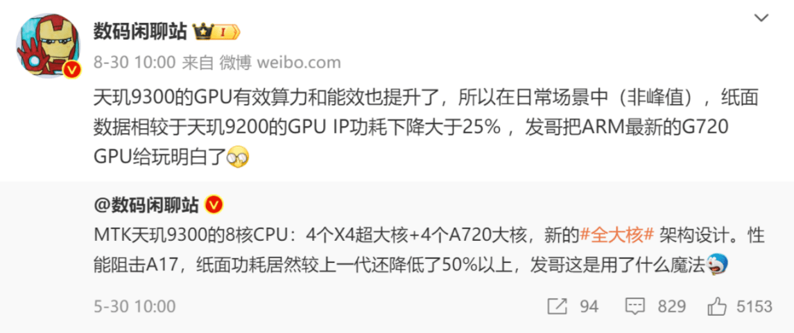 結(jié)合數(shù)碼閑聊站此前爆料,天璣9300采用了創(chuàng)新的全大核CPU架構(gòu),包含4個(gè)Cortex-X4超大核和4個(gè)Cortex-A720大核,在性能大幅提升的同時(shí),功耗還能大幅降低。GPU則搭載了Arm最新的旗艦GPU Immortalis-G720,日常功耗降低超過25%。再加上現(xiàn)在率先落地70億AI大語言模型,天璣9300在CPU、GPU、APU(NPU)方面均行業(yè)領(lǐng)先,三勝驍龍8G3,按這個(gè)節(jié)奏的話,蟬聯(lián)下一代旗艦手機(jī)性能霸主那是妥妥的了。