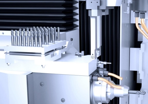 在提升效率的同時(shí),保障加工穩(wěn)定性,孚爾默依靠的是一系列的專用“磨”法。首先,就是VGrind系列開創(chuàng)性的“垂直雙主軸”結(jié)構(gòu),這也是惲總在采訪中提及最多,最為贊賞的一點(diǎn)。VGrind 360E在C軸的最佳轉(zhuǎn)動(dòng)點(diǎn)上采用了上下垂直布局的兩根磨削主軸,砂輪組位于樞軸點(diǎn),與其他結(jié)構(gòu)的雙主軸刃磨機(jī)床相比,大大縮短了線性軸的運(yùn)動(dòng)距離,減少了加工時(shí)間;兩個(gè)定位點(diǎn)的特性,也解決了以往固定和浮動(dòng)軸承的定位問題,極大提升了機(jī)床剛性。兩個(gè)磨削主軸還可裝載不同的砂輪組,配合砂輪自動(dòng)更換裝置能夠確保砂輪組的高效更換。