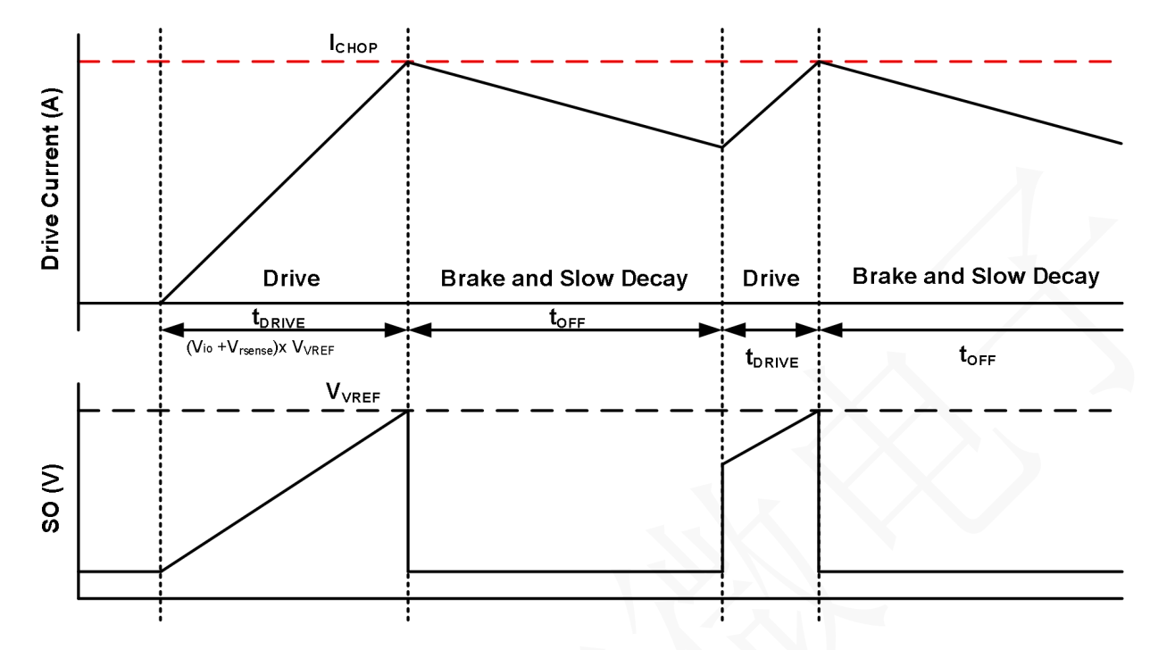 AV放大倍數(shù)增益更加精確,SP/SN外加差分濾波電路,采樣比例更接近理論值,帶電流調(diào)節(jié)功能,可用于限制電機(jī)電流,一般用于電機(jī)啟動(dòng)或者限制電機(jī)功耗。當(dāng)運(yùn)放輸出SO電壓與VREF參考電壓相等的時(shí)候,會(huì)觸發(fā)斬波功能,輸出會(huì)進(jìn)入衰減狀態(tài)。
