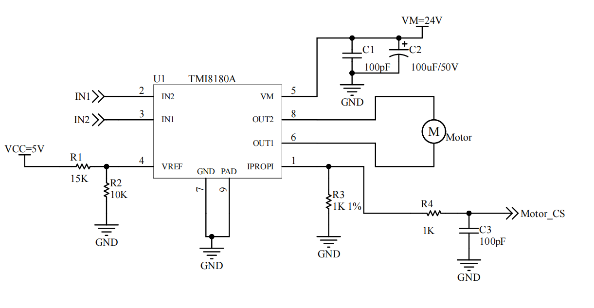 TMI8180A內(nèi)建電流檢測(cè)功能,簡化外圍電路設(shè)計(jì),PCB面積縮小,無需外部功率電阻即可實(shí)現(xiàn)精確電流采樣。對(duì)于常規(guī)直流有刷電機(jī)驅(qū)動(dòng)的電流采樣方案是需要通過串聯(lián)功率電阻進(jìn)行采樣,為了提高采樣精度還需增加運(yùn)算放大器,而TMI8180A只需在IPROPI腳和GND之間串聯(lián)普通的1%電阻即可實(shí)現(xiàn)精確電流采樣。