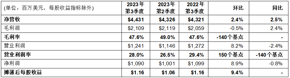 ?第三季度凈營(yíng)收44.3億美元;毛利率47.6%;營(yíng)業(yè)利潤(rùn)率28.0%,凈利潤(rùn)10.9億美元