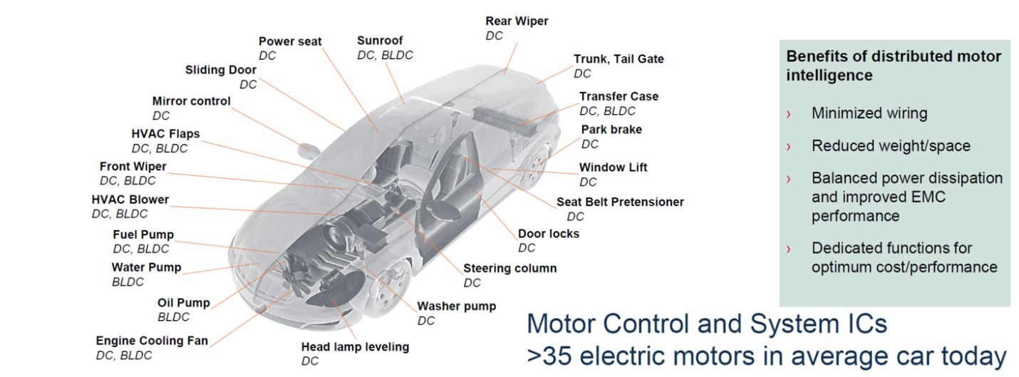 域控制器(DCU)的出現(xiàn)打破了傳統(tǒng)的思維方式,相比于聚焦特有功能,DCU的目標(biāo)則瞄準(zhǔn)于集成度、功能多元化,直接和馬達(dá)驅(qū)動(dòng)相聯(lián)系。DCU之所以引人注目,還由于它引導(dǎo)汽車供應(yīng)商將研發(fā)資金集中在單個(gè)的子系統(tǒng)上,而不是十幾個(gè)以上的不同子裝置。 想要實(shí)現(xiàn)如此復(fù)雜而強(qiáng)大的DCU,汽車供應(yīng)商不再只依賴大多數(shù)現(xiàn)有的成品IC,而更傾向于精心設(shè)計(jì)的集成化器件和更多的電機(jī)執(zhí)行部件。分布式電機(jī)執(zhí)行部件可以帶來眾多優(yōu)勢,包括更少的線束、減輕重量與尺寸,在功耗與EMC性能間達(dá)到良好平衡,更加優(yōu)良的性價(jià)比。因此電機(jī)執(zhí)行部件在域控制器中有更加廣泛的應(yīng)用,例如: