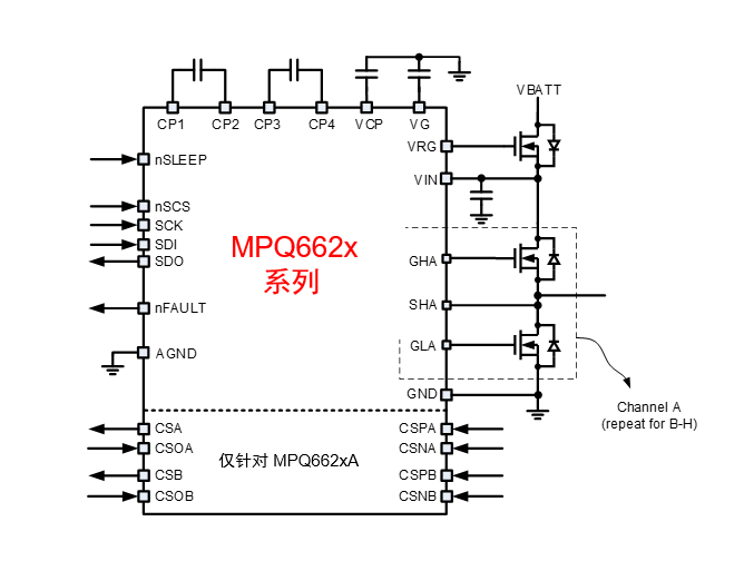 在車身控制方面,MPS的8路PWM汽車級(jí)驅(qū)動(dòng)MPQ662x系列產(chǎn)品,具有6V-40V 輸入電壓和64mA 柵極驅(qū)動(dòng)電流,可以同時(shí)驅(qū)動(dòng)4個(gè)有刷電機(jī),集成性非常強(qiáng)。另外,它還提供SPI串聯(lián)控制接口,其 Charge pump 可用于實(shí)現(xiàn)外部 N-MOS 防反電池保護(hù)和實(shí)現(xiàn)高端柵極驅(qū)動(dòng)支持 100% 占空比 ,而8路PWM可以極大簡化用戶的設(shè)計(jì)。