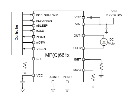 汽車級(jí)全橋馬達(dá)驅(qū)動(dòng) MPQ661x,具有2.7V-36V 輸入電壓,8A 連續(xù)輸出電流,內(nèi)部全H-橋驅(qū)動(dòng)可支持 100% 占空比,MOSFET 導(dǎo)通電阻: HS+LS= 40mΩ,多種MODE可選,如輸入 PWM/DIR、IN1/IN2、獨(dú)立-PWM、并聯(lián)等設(shè)置模式,可兼容 3.3V 和 5V 邏輯電源。
