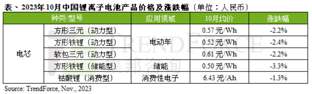 Nov. 3, 2023 ---- TrendForce集邦咨詢表示,由于動力市場整體需求不足,電芯廠商庫存回補的意愿降低,目前以消化現(xiàn)有庫存為主,導(dǎo)致沒有足夠需求支撐上游鋰原料價格,因此均價持續(xù)下滑。10月中國動力電芯均價(以下均以人民幣計)仍處跌勢,但相較8、9月價格趨勢,10月跌幅較先前收斂,電動車用電芯月跌約2%;消費性電子用鈷酸鋰電芯月跌1.3%;儲能型電芯跌幅最高,月跌3.3%。