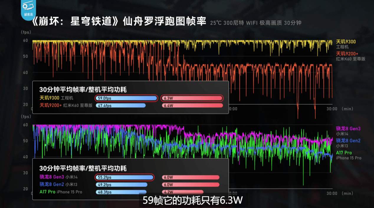 隨后,極客灣又對(duì)《崩壞:星穹鐵道》進(jìn)行了測(cè)試,結(jié)果令人震驚!在相同的755P分辨率下,天璣9300以59幀的成績(jī)完成了崩鐵最高畫質(zhì)的測(cè)試,讓人難以置信!相較于8G3的55幀,這個(gè)59幀的成績(jī)實(shí)在是有點(diǎn)離譜了。同時(shí)功耗也僅為6.3W,并沒有比8G3的55幀功耗高出太多。這意味著只要手機(jī)的散熱性能稍好一些,就能輕松實(shí)現(xiàn)《崩壞:星穹鐵道》滿幀運(yùn)行,這在以前是不可想象的。毫無疑問,天璣9300全大核CPU架構(gòu)和強(qiáng)悍GPU帶來的性能和能效突破,將為手機(jī)玩家?guī)砀訕O致的游戲體驗(yàn)。
