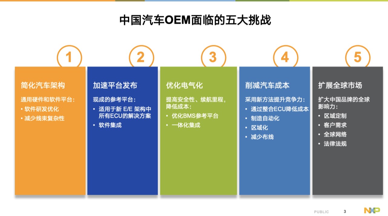 在軟件定義汽車的發(fā)展中,汽車的電子電氣架構(gòu)正在發(fā)生變化。當(dāng)前中國在電氣化領(lǐng)域走在前列,也必然遇到了一系列的挑戰(zhàn)。這些挑戰(zhàn)是當(dāng)下中國OEM所面臨的,也同樣會是接下來全球汽車OEM可能都會遇到的困難。如何幫助中國OEM迎戰(zhàn)這些挑戰(zhàn),加速行業(yè)創(chuàng)新,是恩智浦矢志不渝的方向。
