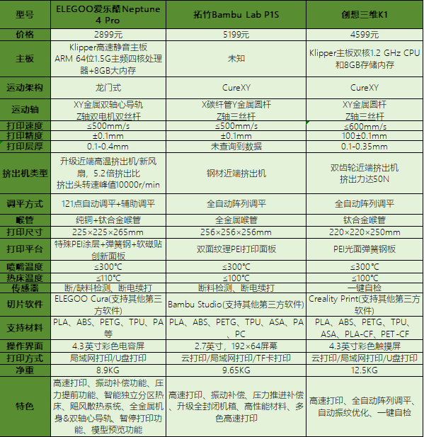 在打印尺寸方面,ELEGOO愛樂酷Neptune 4 Pro是225×225×265mm,創(chuàng)想三維K1為220×220×250mm,這兩臺(tái)比較接近。拓竹Bambu Lab P1S則是256×256×256mm,稍微大一些。這三臺(tái)產(chǎn)品較大的打印尺寸,可以更好地滿足使用者大尺寸打印需求,以及一次性打印更多模型文件。