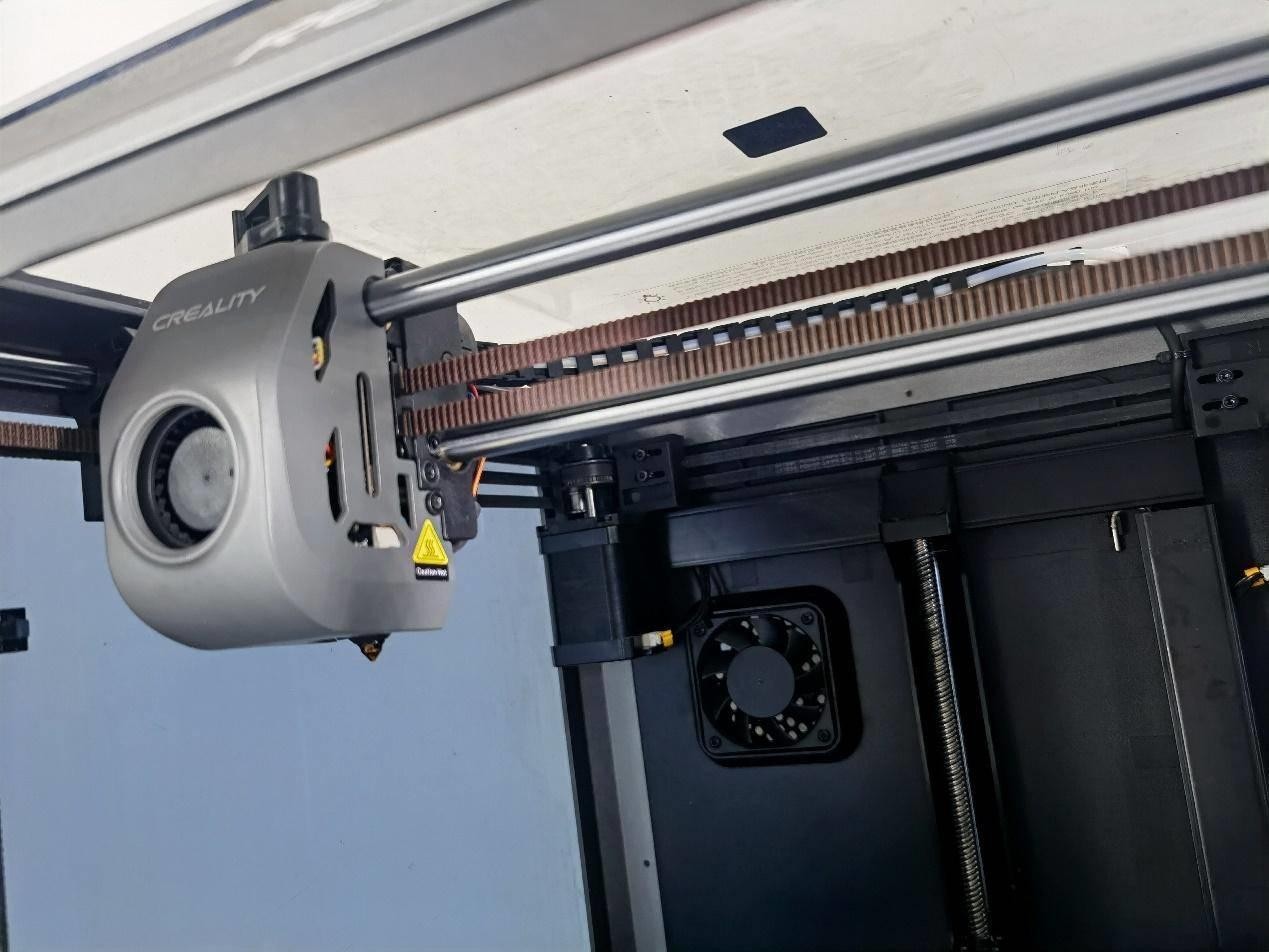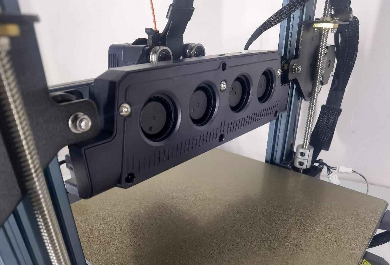 在散熱冷卻方面,除了在后板上安裝機(jī)箱風(fēng)扇來控制腔體溫度,創(chuàng)想三維K1還在機(jī)器的右側(cè)板上安裝了一個(gè)18W的輔助渦輪散熱風(fēng)扇。該風(fēng)扇專門用于對(duì)當(dāng)前打印的層進(jìn)行吹風(fēng),進(jìn)一步增強(qiáng)模型的冷卻效果,可有效減少拉絲和翹曲現(xiàn)象。