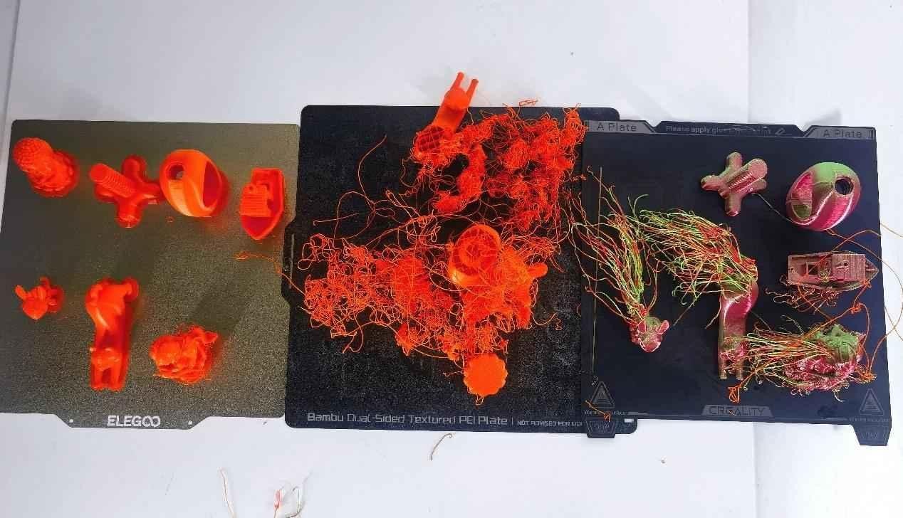 拓竹Bambu Lab P1S和創(chuàng)想三維K1則通過移動(dòng)熱床,配合噴頭移動(dòng)打印。這兩款機(jī)子打印出來不大順利,看來一次性打印多個(gè)模型文件,還是比較容易出錯(cuò)。