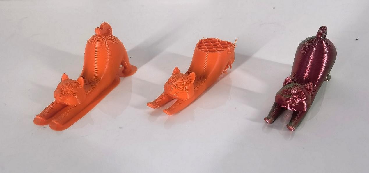 首先是一個(gè)貓咪模樣的手機(jī)架,可以看到ELEGOO愛樂酷Neptune 4 Pro和創(chuàng)想三維K1都完成了打印,整體造型和細(xì)節(jié)都比較完美。拓竹Bambu Lab P1S只打印出來了大部分,貓屁股缺失。