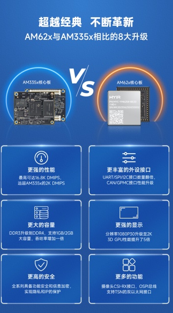 AM335x是TI經(jīng)典的工業(yè)MPU,它引領(lǐng)了一個(gè)時(shí)代,即工業(yè)市場(chǎng)從MCU向MPU演進(jìn),幫助產(chǎn)業(yè)界從Arm9迅速遷移至高性能Cortex-A8處理器。隨著工業(yè)4.0的發(fā)展,HMI人機(jī)交互、工業(yè)工控、醫(yī)療等領(lǐng)域的應(yīng)用面臨迫切的升級(jí)需求,AM62x處理器作為TI Sitara?產(chǎn)品線新一代MPU產(chǎn)品,相比上一代經(jīng)典處理器AM335x具備更高性能及功能擴(kuò)展性,在內(nèi)核、GPU、存儲(chǔ)、顯示、安全、外設(shè)等6大方面實(shí)現(xiàn)性能大升級(jí)。
