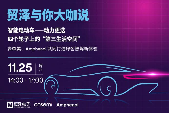 2023年11月22日——專注于引入新品并提供海量庫存?的電子元器件代理商貿(mào)澤電子(Mouser Electronics)宣布將于11月25日14:00-17:00舉辦“2023貿(mào)澤與你大咖說”系列直播。本期特邀來自安森美(onsemi)和Amphenol的資深技術(shù)專家及業(yè)界大咖,以智能電動車——動力更迭,四個輪子上的“第三生活空間”為主題,分享中國智能電動汽車市場情況及整體技術(shù)變化演進的趨勢,攜手打造綠色智駕新體驗。