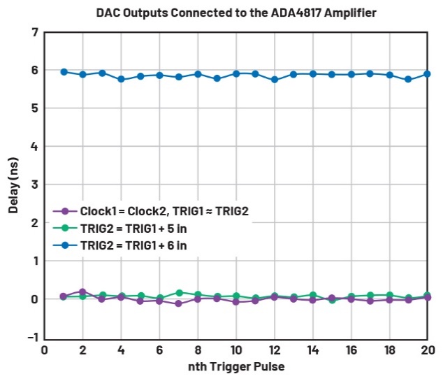 如圖6的簡化圖所示,器件間的輸出同步是通過測量多個器件的同一DAC輸出通道(即通道1)之間的延遲來實現(xiàn)的。相對于TRIG1(控制器板到板1)改變TRIG2(控制器板到板2)的連接器長度,以及相對于時鐘1(時鐘發(fā)生器到板1)改變時鐘2(時鐘發(fā)生器到板2)的連接器長度,這兩種情況對同步的影響可以使用示波器進行觀察。