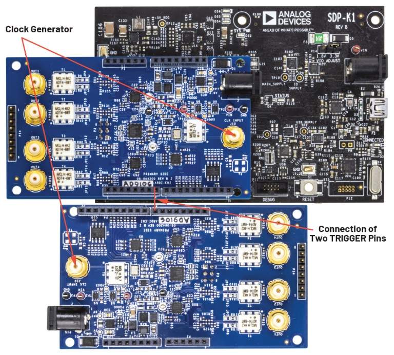 接下來應(yīng)設(shè)置圖7所示每個板的時鐘輸入和TRIGGER引腳的連接,然后設(shè)置表1中的其余連接。將板1安裝到SDP-K1 Arduino Uno端口,然后將板2放置在與板1成180°的位置,以使兩個板的TRIGGER引腳并排放置。這是TRIG2到SDP-K1數(shù)字輸出的最短連接,由此TRIG1和TRIG2路徑大致相等。