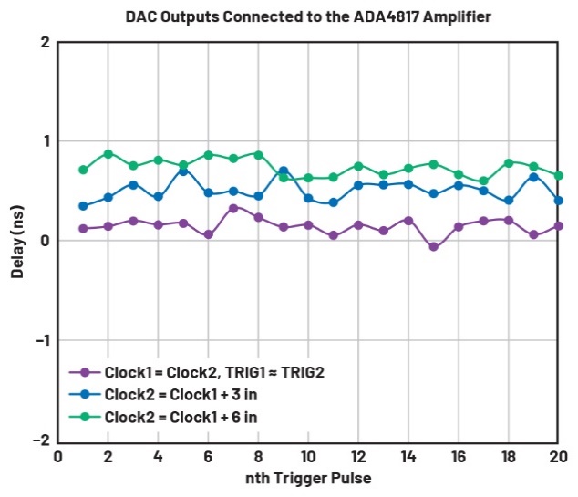 圖9.不同TRIG2連接器長度下板1和板2的OUT 1之間的延遲。