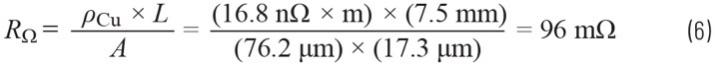 接下來,我們考慮導(dǎo)電芯區(qū)域PCB走線的I2R損耗。如圖8所示,從TS1或TS4到導(dǎo)電芯外緣的距離為7.5毫米。利用單條PCB走線的電阻公式(見圖4)和銅的電導(dǎo)率,我們可以計算出以下結(jié)果: