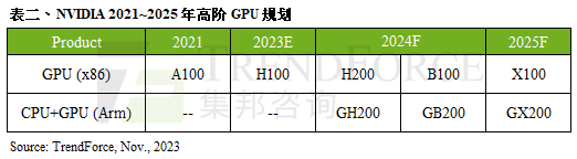 展望2024年,觀察目前各AI芯片供應(yīng)商的項(xiàng)目進(jìn)度,NVIDIA 2023年的高端AI芯片(采用HBM)的既有產(chǎn)品為A100/A800以及H100/H800;2024年則將把產(chǎn)品組合(Product Portfolio)更細(xì)致化的分類。除了原上述型號(hào)外,還將再推出使用6顆HBM3e的H200以及8顆HBM3e的B100,并同步整合NVIDIA自家基于Arm架構(gòu)的 CPU與GPU,推出GH200以及GB200。