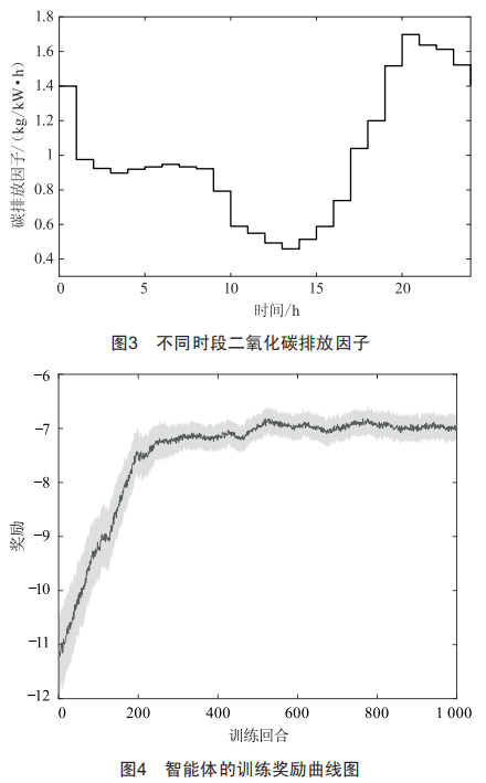 3)獎勵rt是環(huán)境對智能體動作at的及時反績。依據(jù)上文建立的優(yōu)化模型,本文設(shè)計獎勵rt包含二氧化碳排放成本CCO2以及運行成本兩項,其中運行成本包含購電成本C1與儲能損耗成本C2: