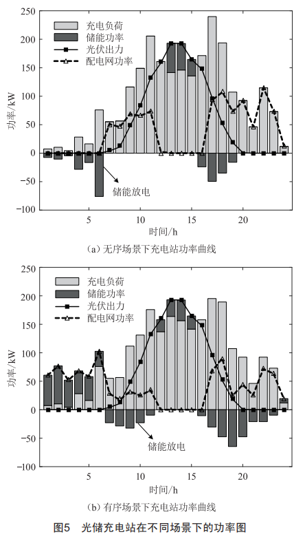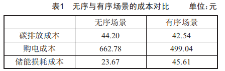 光儲充電站在無序與有序場景下的功率曲線如圖5所示,無序與有序場景的成本對比如表1所示。