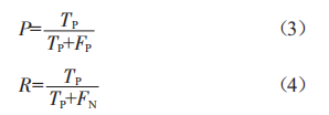 對(duì)模型的裂縫檢測(cè)能力進(jìn)行評(píng)估,引入了模型的評(píng)價(jià)指標(biāo)。準(zhǔn)確率P表示預(yù)測(cè)樣本中正樣本比例,召回率R表示預(yù)測(cè)樣本中實(shí)際正樣本數(shù)占所有預(yù)測(cè)樣本的比例,其計(jì)算公式分別如式(3)和(4)所示:
