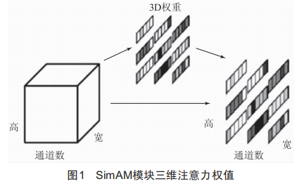本文引入simAM注意力模塊[9],這是一種輕量級(jí)即插即用模塊,是受人腦注意力機(jī)制啟發(fā)而提出的一種具有三維權(quán)重的注意力模型。如圖1所示,在該模型中對(duì)明顯表現(xiàn)出空間抑制效應(yīng)的神經(jīng)元給予更高的權(quán)重,權(quán)重通過一個(gè)能量函數(shù)來計(jì)算,如式(1)所示: