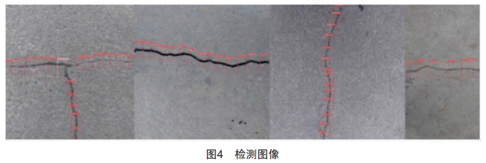 在預(yù)熱時(shí),YOLOv5s利用一維線性插值去更新每次選代的學(xué)習(xí)率,當(dāng)達(dá)到預(yù)設(shè)值時(shí),再通過余弦退火算法對(duì)學(xué)習(xí)率進(jìn)行不斷更新。經(jīng)過訓(xùn)練得到最優(yōu)權(quán)重,將最優(yōu)權(quán)重傳入Detect.py文件中用于最終檢測(cè)。檢測(cè)結(jié)果如圖4所示,可以看出該模型能準(zhǔn)確識(shí)別出裂縫、網(wǎng)狀裂縫和坑洞目標(biāo),初步達(dá)到預(yù)定要求。