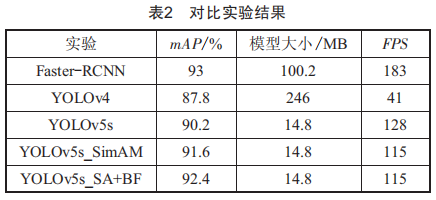 由表2可知,相比YOLOv4和FaSter—RCNN算法YOLOv5S更具輕量性和實(shí)時(shí)性,模型僅有14.8 MB,在模型大小上更具優(yōu)勢(shì)。由于SimAM的無參性,改進(jìn)后的模型對(duì)每張圖像的推理耗時(shí)并未產(chǎn)生影響,每秒可處理52.6峽圖片。在平均精度上,加入注意力機(jī)制后的YOLOv5S—SimAM算法比原始YOLOv5S算法精度提高了1.4%,而YOLOv5S—SA+BF相比原始算法檢測(cè)精度提高了2.2%,召回率為04.5%,且檢測(cè)速度沒有太大區(qū)別,仍能滿足實(shí)時(shí)性需求。
