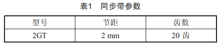 本機(jī)采用圓弧齒形帶,減少齒形帶滑動(dòng)可能性以及反轉(zhuǎn)時(shí)的反沖力,同步帶與帶輪齒嗤合>6齒,故同步帶輪最小齒數(shù)為12,一般最小齒數(shù)在15以上。步進(jìn)電機(jī)驅(qū)動(dòng)同步帶輪轉(zhuǎn)動(dòng),同步帶輪齒數(shù)越多,直徑越大,也就是步進(jìn)電機(jī)單位步數(shù)下同步帶的位移越大,間接影響3D打印機(jī)的精度。綜合考慮,2GT同步帶最為合適,具體參數(shù)如表1所示。