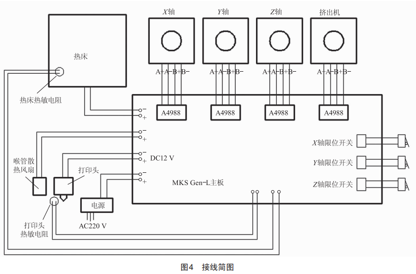 本機(jī)選擇控制系統(tǒng)性價(jià)比較高的42步進(jìn)電機(jī)作為動(dòng)力元件,如圖3所示,其中低功率加熱棒為噴嘴加熱供熱元件;熱床采用1Ω電阻絲,以12 V直流電對(duì)其進(jìn)行加熱;X、Y方向以限位開(kāi)關(guān)進(jìn)行行程控制,Z方向則以紅外傳感器來(lái)控制行程。主控制板選擇將Arduino Mega2560、RAMPS1.4集合在一塊板子的集成板MKS Gen-L上,它采用可插拔驅(qū)動(dòng)模塊,兼容4988驅(qū)動(dòng)器、8825驅(qū)動(dòng)器以及TMc2100驅(qū)動(dòng)器;使用開(kāi)源固件Marlin。接線如圖4所示。