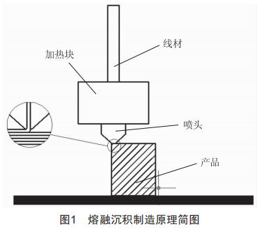 FDM型3D打印機(jī)主要由工作平臺(tái)、送絲裝置、加熱噴頭、耗材存儲(chǔ)裝置和控制系統(tǒng)組成[3],其耗材主要為熱塑性材料,如ABS、PLA等。工作原理是通過(guò)擠出機(jī)將絲狀原料送入熱熔噴頭,打印頭加熱塊將材料加熱熔化,然后從噴頭擠出,打印頭按照產(chǎn)品切片輪廓路徑運(yùn)動(dòng),將擠出的半流動(dòng)熱塑材料反復(fù)逐層堆積成型,如圖1所示。