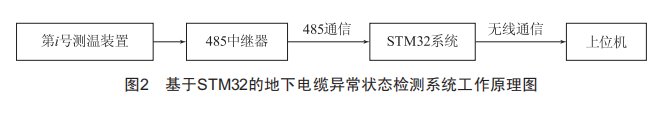 為了便于后續(xù)檢修,在填埋地下電纜時會預留電纜井打通地下電纜管道與地面。在設計電纜線路時,直線鋪設電纜時每隔40 m設置一個電纜井,在電纜拐彎處另設電纜井。基于STM32的地下電纜異常狀態(tài)檢測系統(tǒng)以架空線路轉(zhuǎn)接電纜線路的電纜井為起點,直線方向上每隔20個電纜井作為一個整體安裝一套完整的下位機裝置,并在電纜拐角處另立起點重新以直線方向的20個電纜井為間隔裝設下位機裝置,在直線電纜的末端,不足20個電纜井的距離也單獨裝設一套下位機裝置?;赟TM32的地下電纜異常狀態(tài)檢測系統(tǒng)工作原理圖如圖2所示。