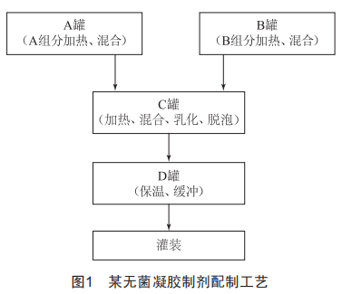 本文以分兩段的一種連續(xù)生產(chǎn)型帶CIP/SIP配制系統(tǒng)為例闡述具體方案,生產(chǎn)產(chǎn)品為無菌凝膠制劑。1.2.1配制工藝簡介