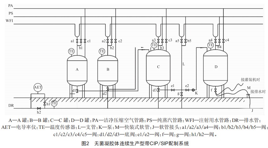 如圖2所示,無菌凝膠體連續(xù)生產(chǎn)型帶CIP/SIP配制系統(tǒng)包括A罐、B罐、C罐、D罐、潔凈壓縮空氣管路PA、純蒸汽管路PS、注射用水管路WFI、排水管DR、電導(dǎo)率儀AET、溫度傳感器TE、支管L、泵K、快裝式軟管M、閥a1/a2/a3/a4、閥b1/b2/b3/b4/b5、閥c1/c2/c3/c4/c5、底閥d1/d2/d3、閥e1/e2、閥f、閥g、閥h1/h2。其中,A罐、B罐為帶攪拌、噴淋球、夾套的反應(yīng)罐,C罐為帶內(nèi)攪拌/外刮板、乳化、抽真空、噴淋球、夾套的反應(yīng)罐,D罐為帶噴淋球、夾套的貯罐。
