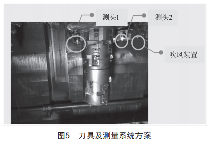 為降低刀具磨損及加工成本,本方案采用兩片CBN耐磨刀具,刀夾及僅桿可外脹收縮。測量系統(tǒng)選擇馬波斯雙測量系統(tǒng),即加工前檢測及加工后檢測。為保證能夠精準(zhǔn)測量氣缸體上平面質(zhì)量,加工前及加工后檢測均選擇雙探頭,并在測頭增加吹風(fēng)裝置,如圖5所示,防止加工過程中鐵屑影響測量結(jié)果。加工取雙探頭數(shù)據(jù)平均值作為最終測量值,并將數(shù)據(jù)反績給機床[5]。