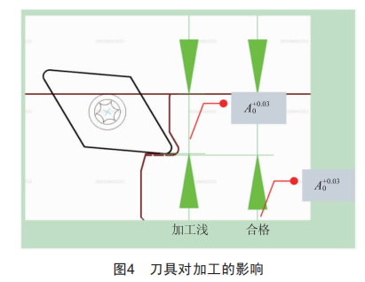 如圖3所示,由于上工序來料氣缸體上平面存在傾斜風(fēng)險,雖然傾斜不大,但因止口深度公差過小,止口刀具加工面為唯一平面,這就可能導(dǎo)致止口圓周范圍內(nèi)部分區(qū)域深度超差,即同一缸內(nèi)止口深度不一致,所以止口深度與氣缸體上平面加工最好在同一道工序進行,但對于不在同一道工序加工的,需要采用較為復(fù)雜的工藝進行控制,方能達到產(chǎn)品設(shè)計要求。