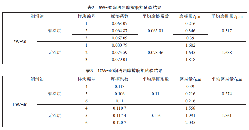 表2、表3顯示了使用不同型號的潤滑油時樣塊的摩擦系數(shù)和磨損量的試驗結果。